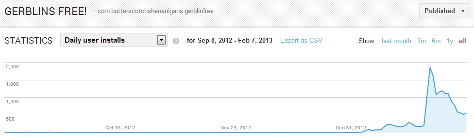 Over the course of the next 2 weeks, more copies of the APK started popping up at various pirate sites around the web. We decided to just roll with it and see what would happen. All of a sudden, on January 4th, we got a spike in downloads on Google Play. By "a spike" I mean 21 downloads, but for Gerblins, that was a huge improvement over our normal zero.