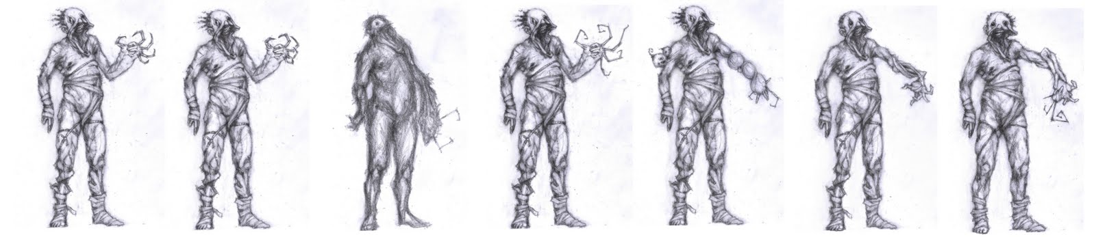 Clothes have been determined to be nothing but a few bandages. Also started studying how the head might look viewed from the side, which turned out to be not a simple task. (Click to enlarge.)